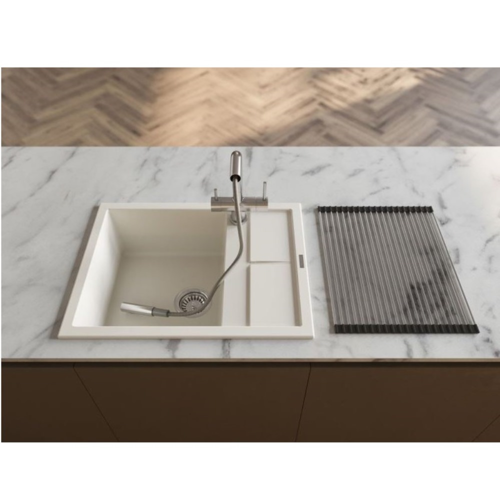 Мойка кухонная Omoikiri из коллекции Sumi 65A-GR имеет размеры 650х500 мм., изготовлена из искусственной керамики. Форма — прямоугольная, одна чаша без отверстия для смесителя. Сифон в комплекте. Ширина чаши 38. Врезной монтаж. Имеется крыло.