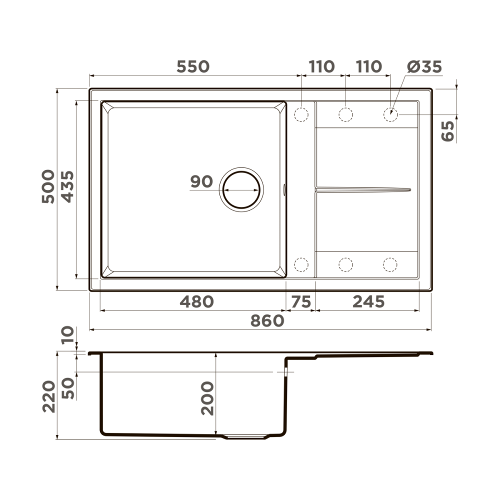 Мойка кухонная Omoikiri из коллекции Sumi 86-BE имеет размеры 860х500 мм., изготовлена из искусственного гранита. Форма — прямоугольная, одна чаша без отверстия для смесителя. Сифон в комплекте. Ширина чаши 48. Врезной монтаж.