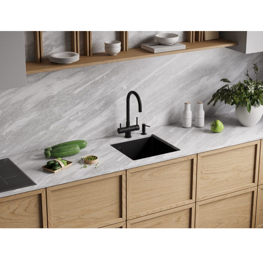 Смеситель для кухни Omoikiri Akita с подключением фильтра оснащен рычажным управлением для регулировки температуры и напора воды. Горизонтальный монтаж на 1 отверстие. Поворотный излив 195 мм.
