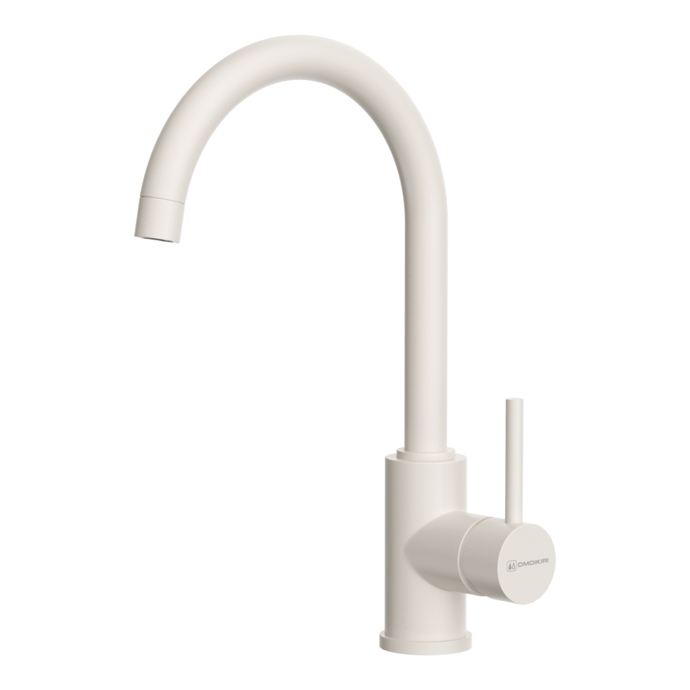 Смеситель для кухни Omoikiri Shinagawa-P оснащен рычажным управлением для регулировки температуры и напора воды. Горизонтальный монтаж на 1 отверстие. Поворотный излив 182 мм.
