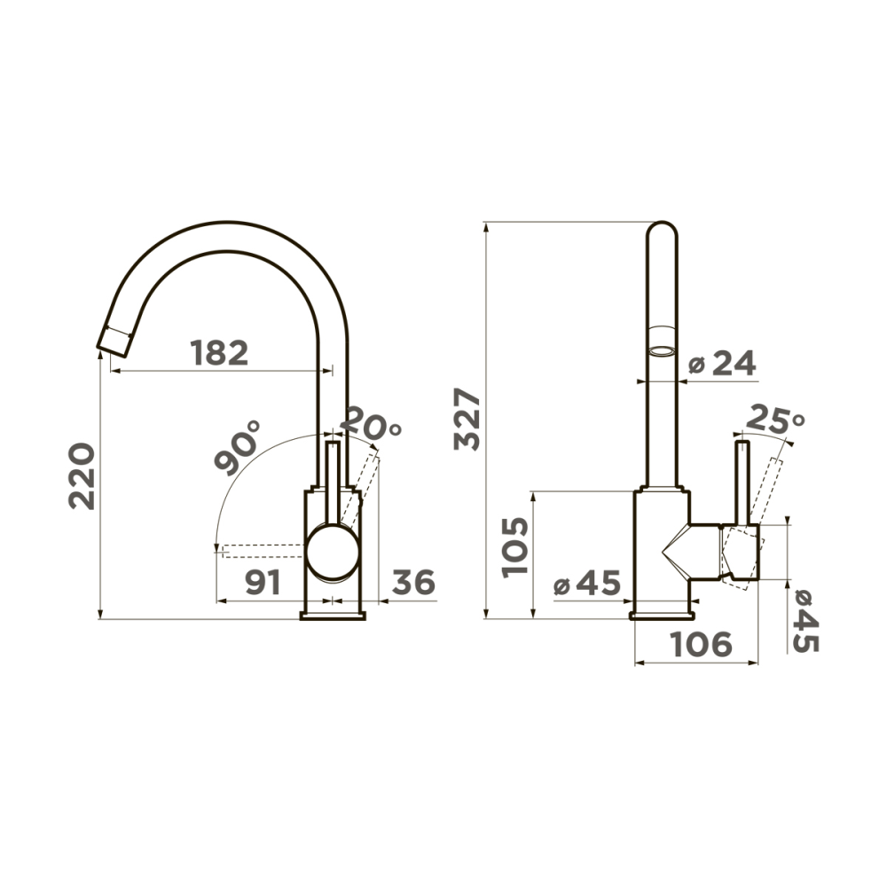Смеситель для кухни Omoikiri Shinagawa-P оснащен рычажным управлением для регулировки температуры и напора воды. Горизонтальный монтаж на 1 отверстие. Поворотный излив 182 мм.