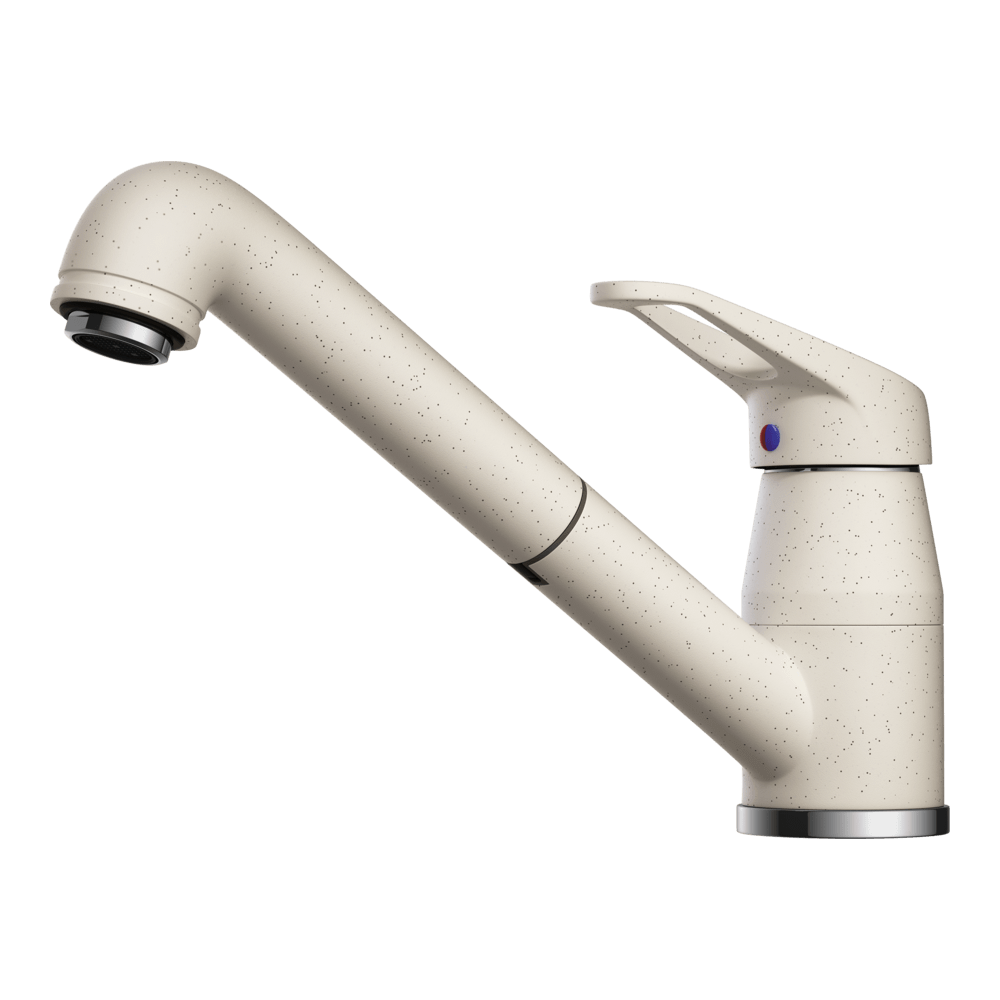 Смеситель для кухни Omoikiri Tateyama-S оснащен рычажным управлением для регулировки температуры и напора воды. Горизонтальный монтаж на 1 отверстие. Вытяжной излив 258 мм.