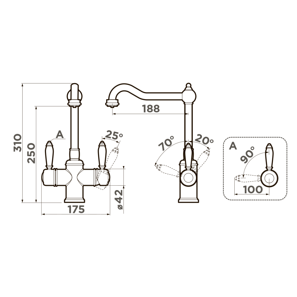 Смеситель для кухни Omoikiri Tottori с подключением фильтра оснащен рычажным управлением для регулировки температуры и напора воды. Горизонтальный монтаж на 1 отверстие. Поворотный излив 188 мм.