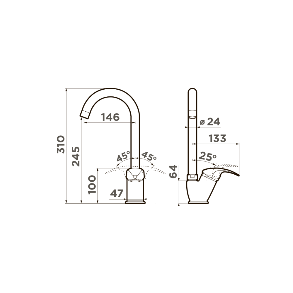 Смеситель для кухни Omoikiri Umi оснащен рычажным управлением для регулировки температуры и напора воды. Горизонтальный монтаж на 1 отверстие. Поворотный излив 146 мм.